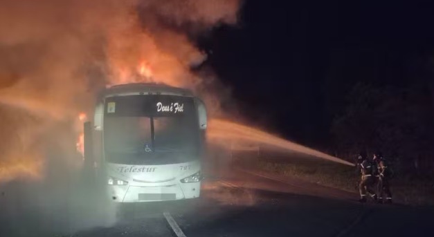 Um ônibus de turismo pegou fogo na BR-343 em Floriano (PI) por volta das 22h40 no domingo (4). O